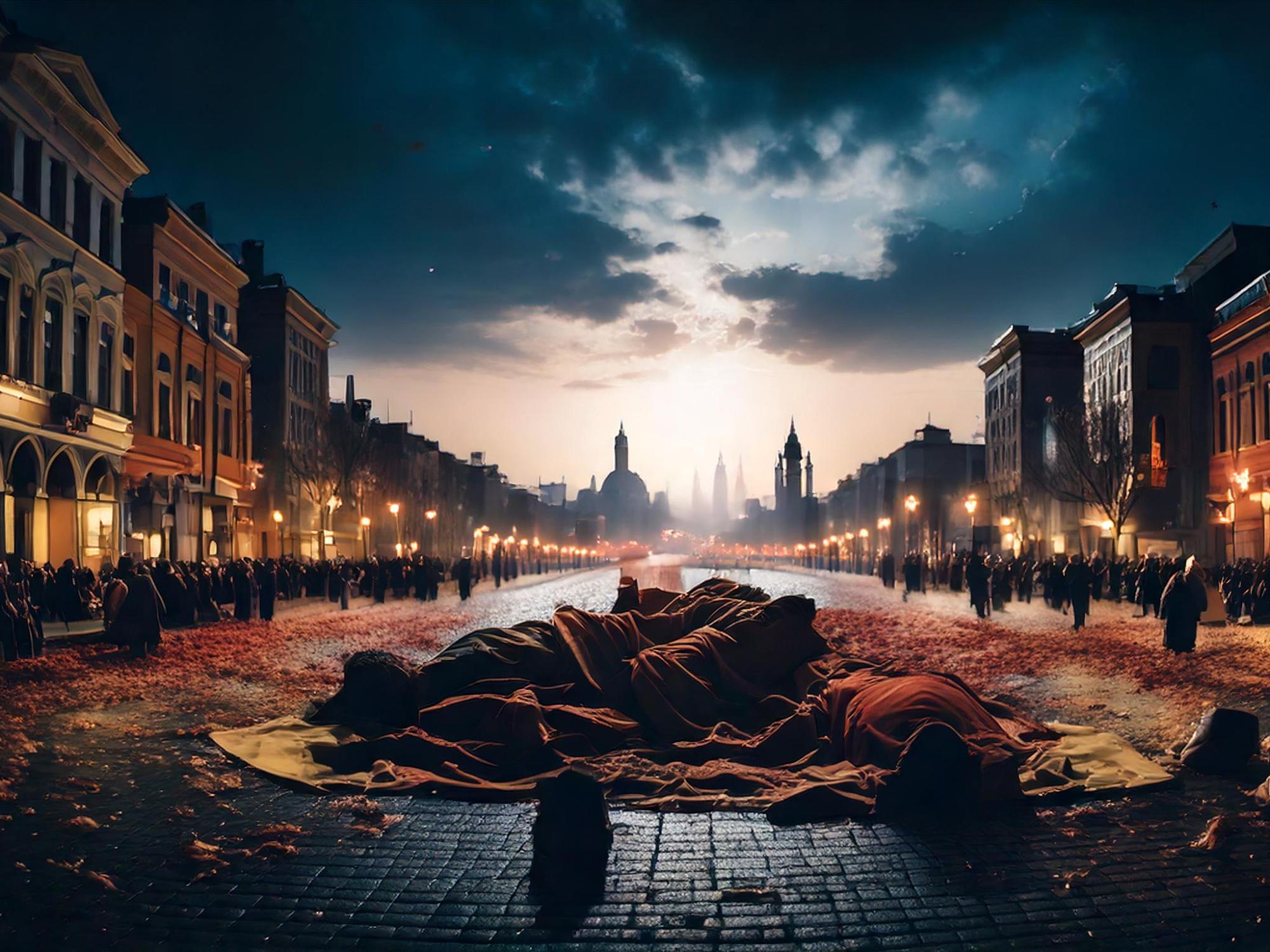 In streets they lie, unburied, cold,